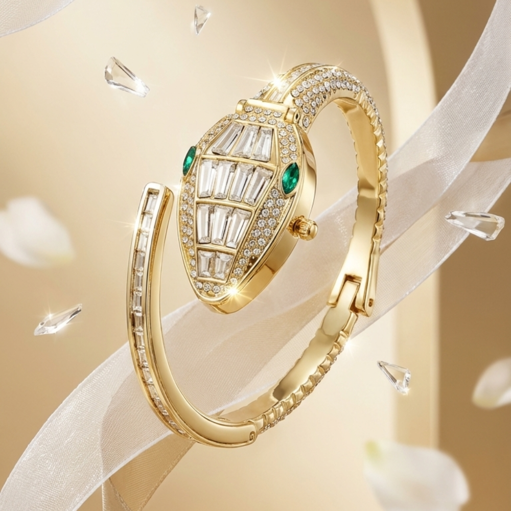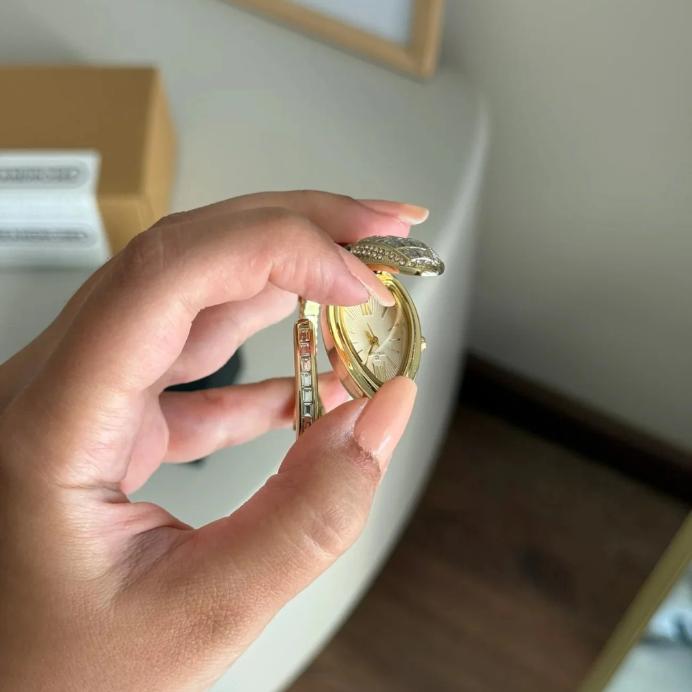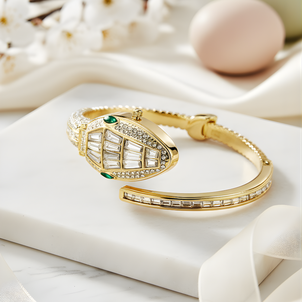 Elegant 18K gold plated anti-tarnish snake bangle watch featuring sparkling crystal stones and rich emerald accents. The unique serpent-inspired design hides a stylish watch inside, combining luxury jewelry and timepiece in one statement accessory. Perfect for special occasions and elegant styling.