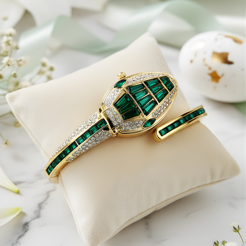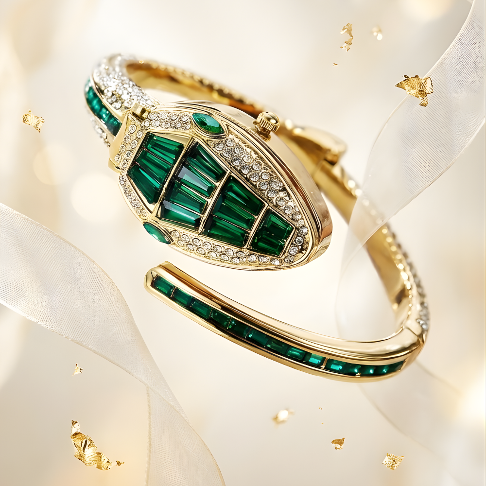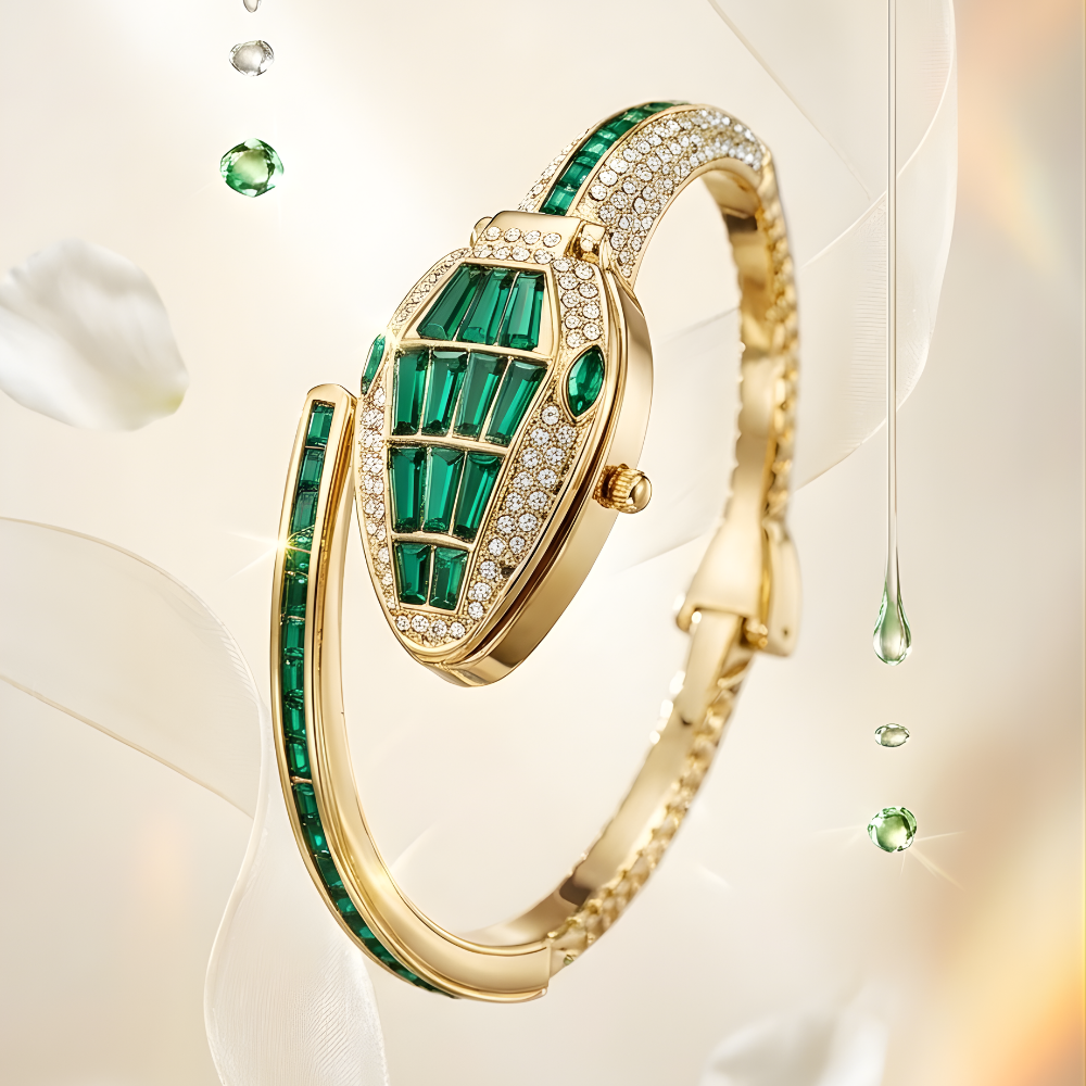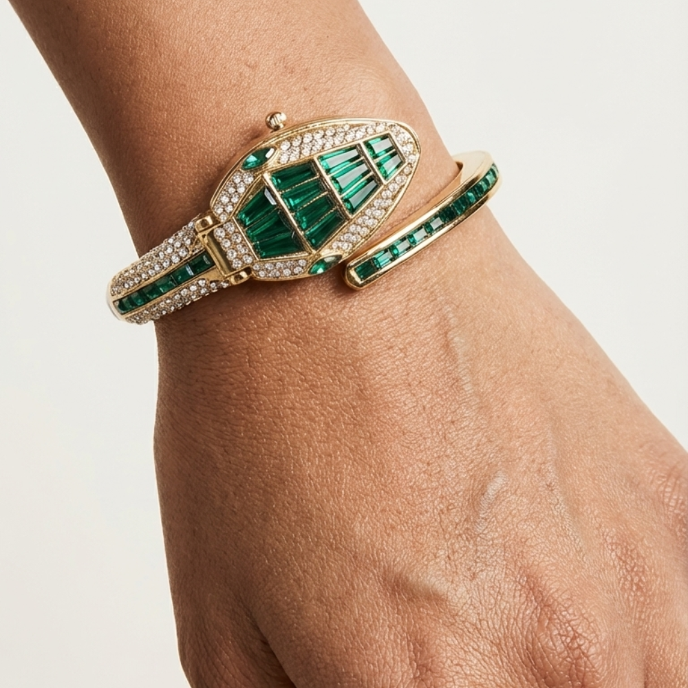 Elegant 18K gold plated anti-tarnish snake bangle watch featuring sparkling crystal stones and rich emerald accents. The unique serpent-inspired design hides a stylish watch inside, combining luxury jewelry and timepiece in one statement accessory. Perfect for special occasions and elegant styling.