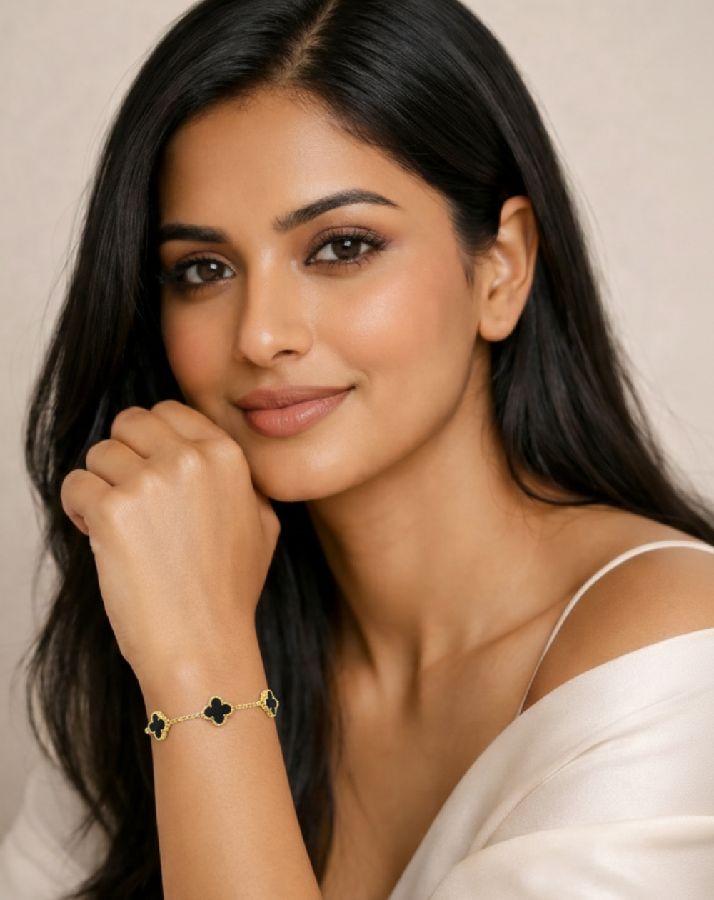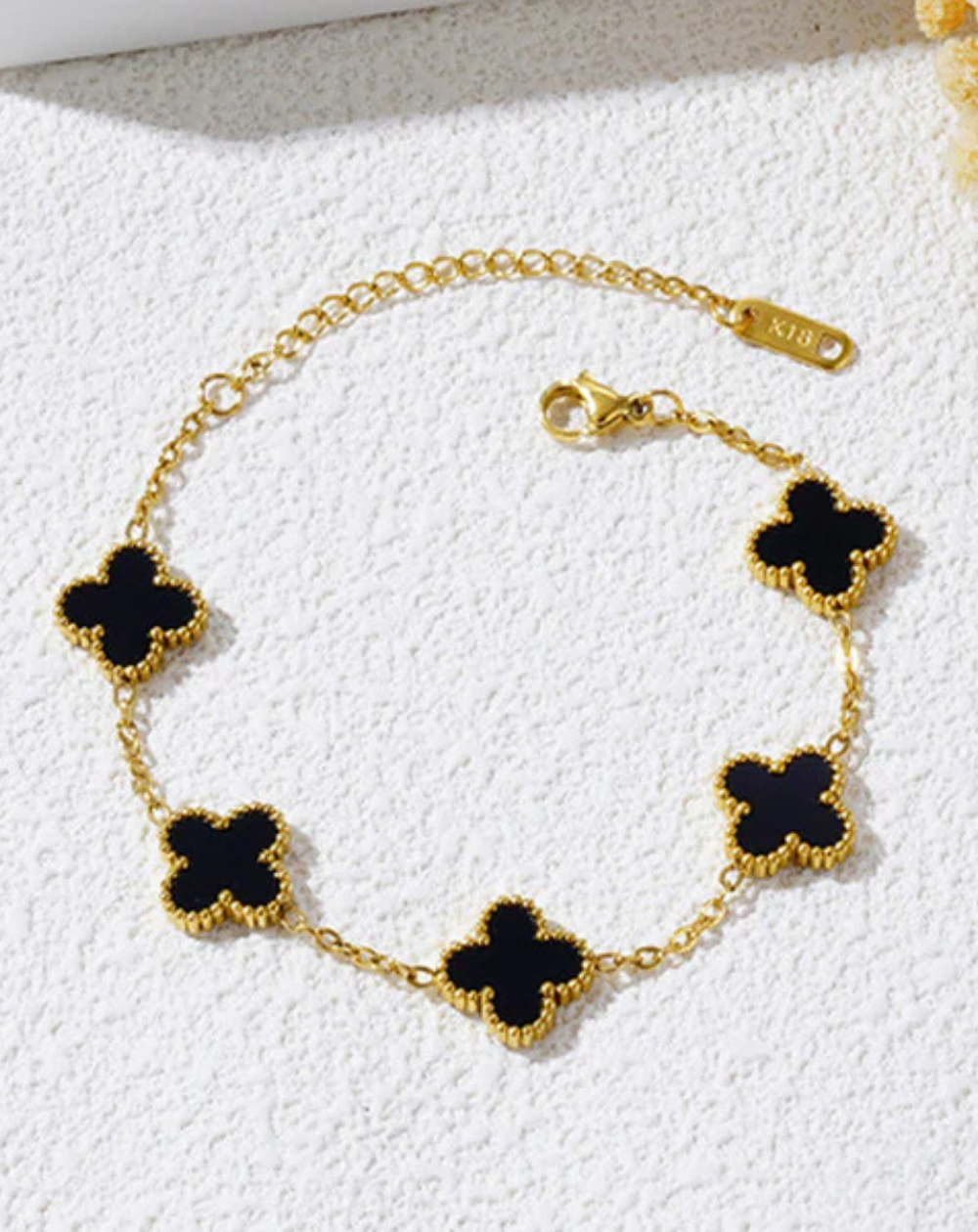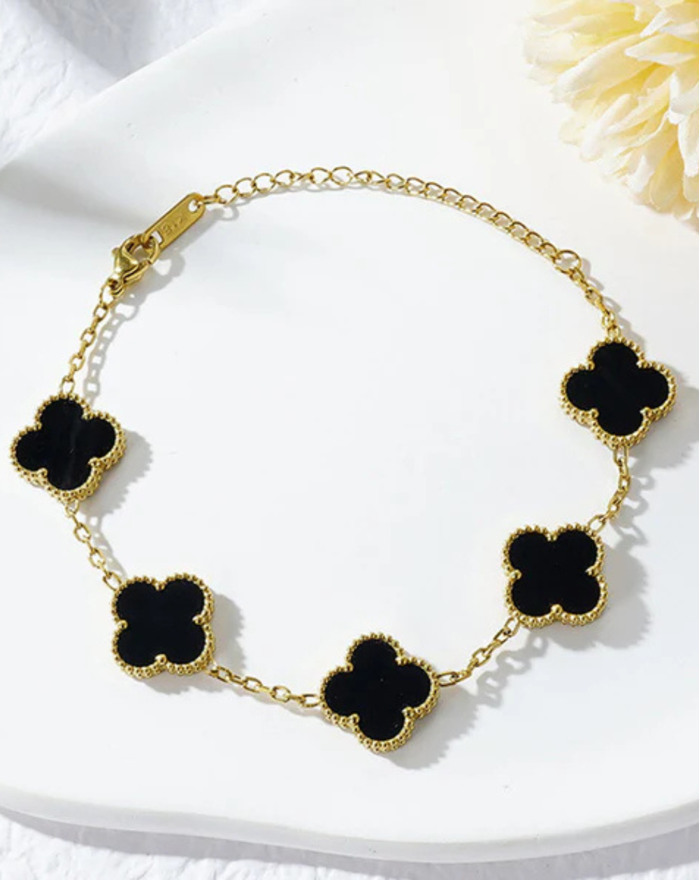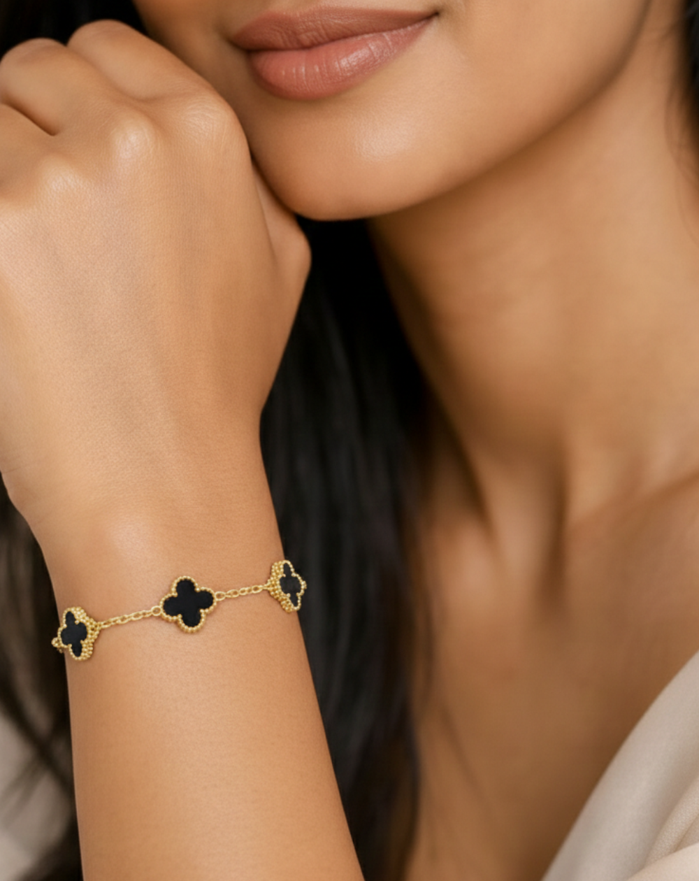 Add a touch of timeless elegance to your everyday look with this delicate clover charm bracelet. Designed with fine gold-plated links and iconic four-leaf clover motifs, this bracelet symbolizes luck, beauty, and sophistication. The smooth enamel/mother-of-pearl style inlays paired with detailed gold beaded edges create a luxurious yet minimal aesthetic—perfect for daily wear or special occasions.
