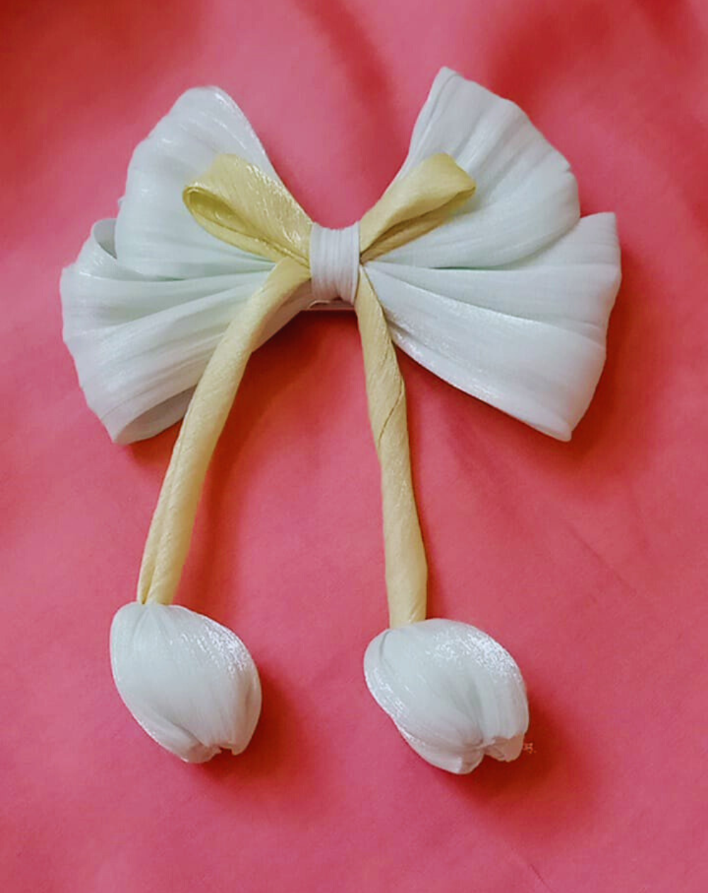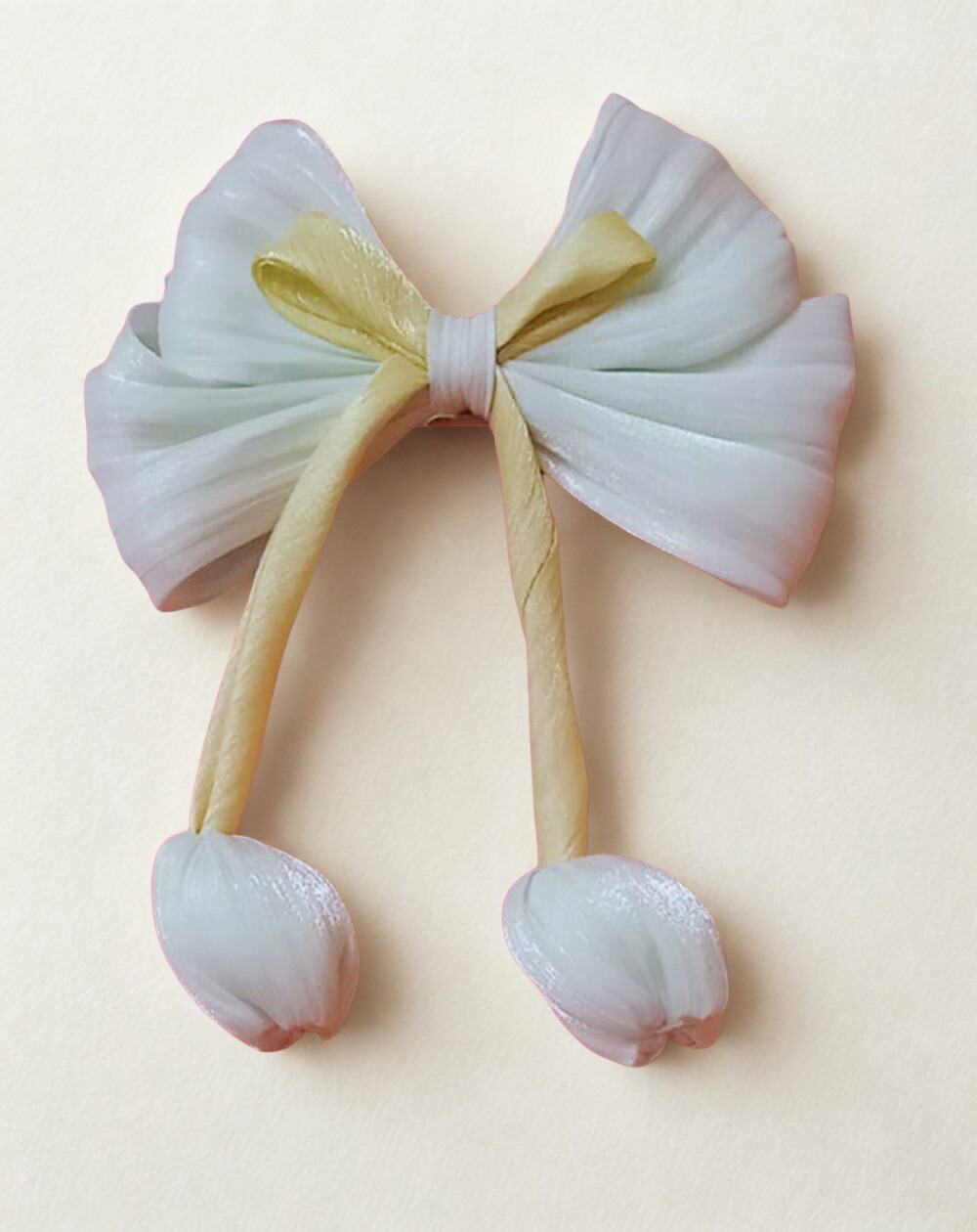 Designed with a sheer ivory organza bow, pastel ribbon detailing, and handcrafted tulip-shaped fabric drops, this accessory blends elegance with a cute, romantic style. The lightweight design sits naturally in the hair, making it perfect for half-up hairstyles, ponytails, or loose hair.