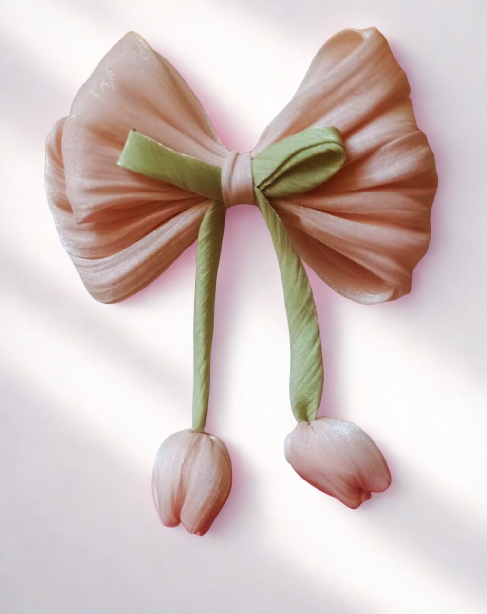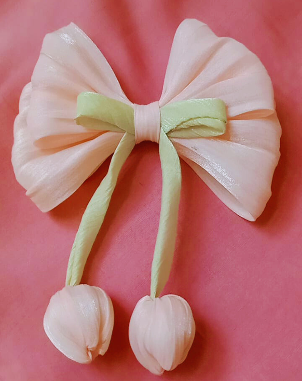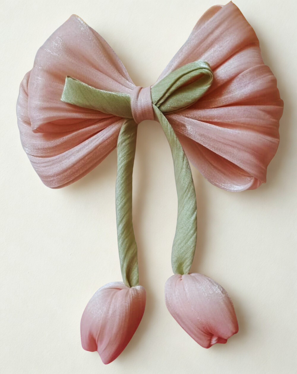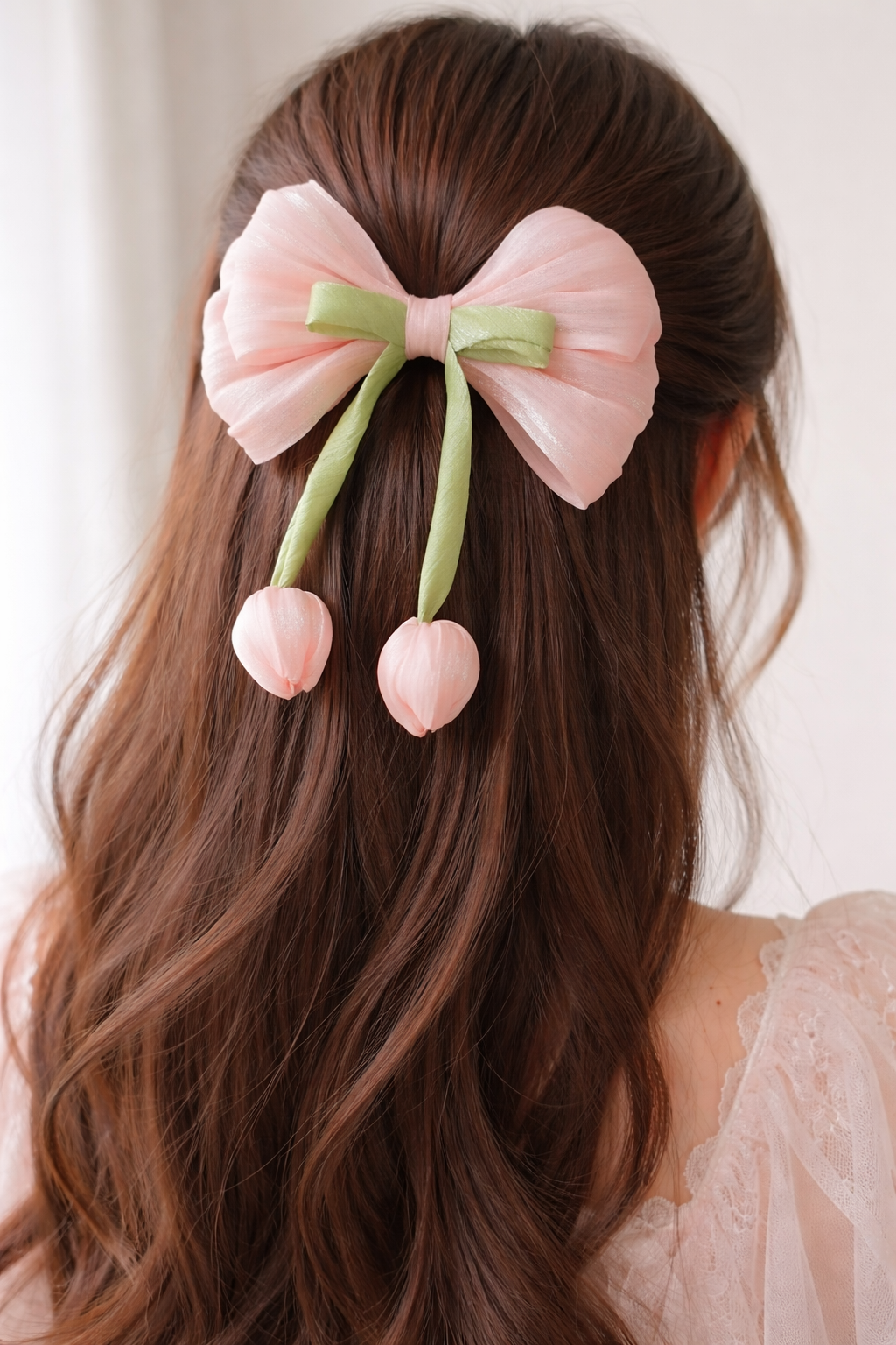 Designed with a sheer ivory organza bow, pastel ribbon detailing, and handcrafted tulip-shaped fabric drops, this accessory blends elegance with a cute, romantic style. The lightweight design sits naturally in the hair, making it perfect for half-up hairstyles, ponytails, or loose hair.