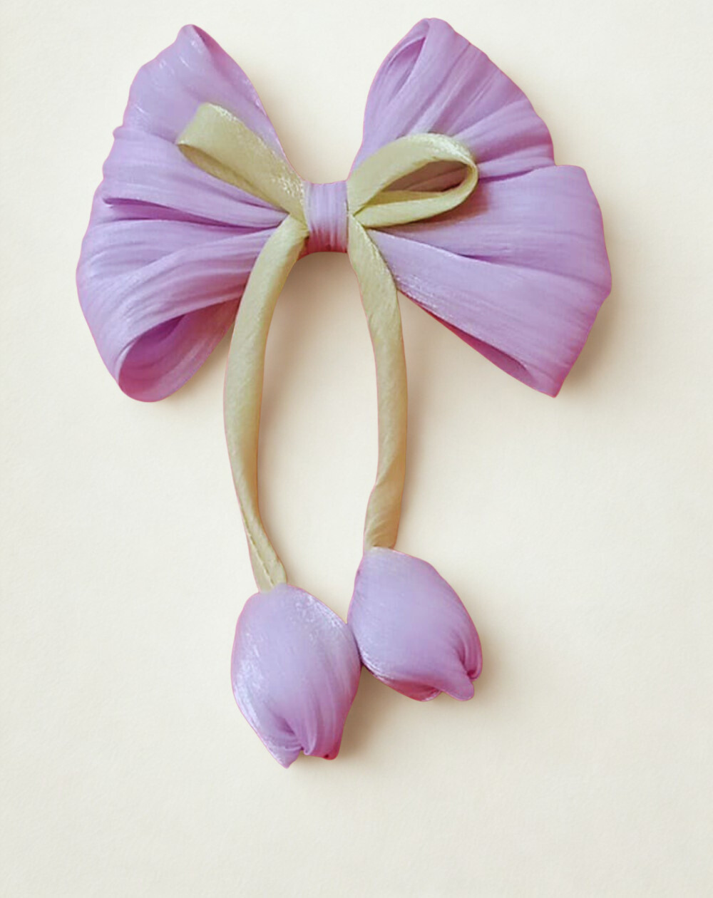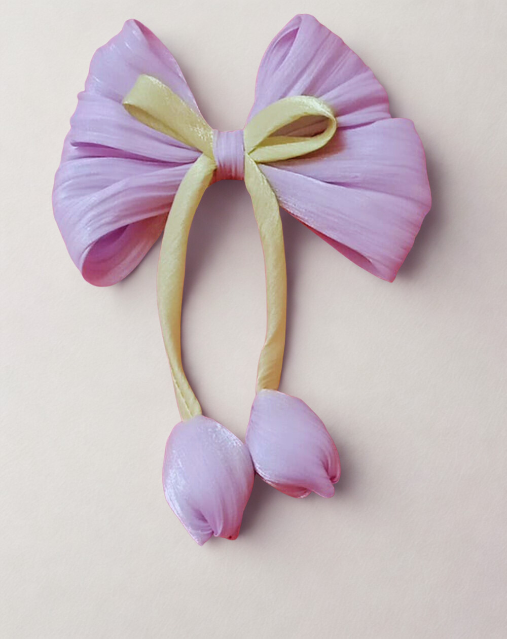 Designed with a sheer ivory organza bow, pastel ribbon detailing, and handcrafted tulip-shaped fabric drops, this accessory blends elegance with a cute, romantic style. The lightweight design sits naturally in the hair, making it perfect for half-up hairstyles, ponytails, or loose hair.