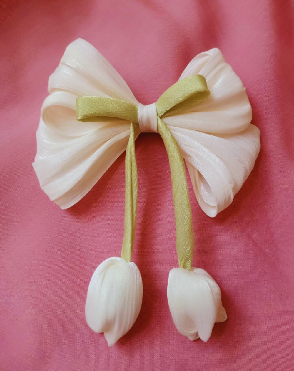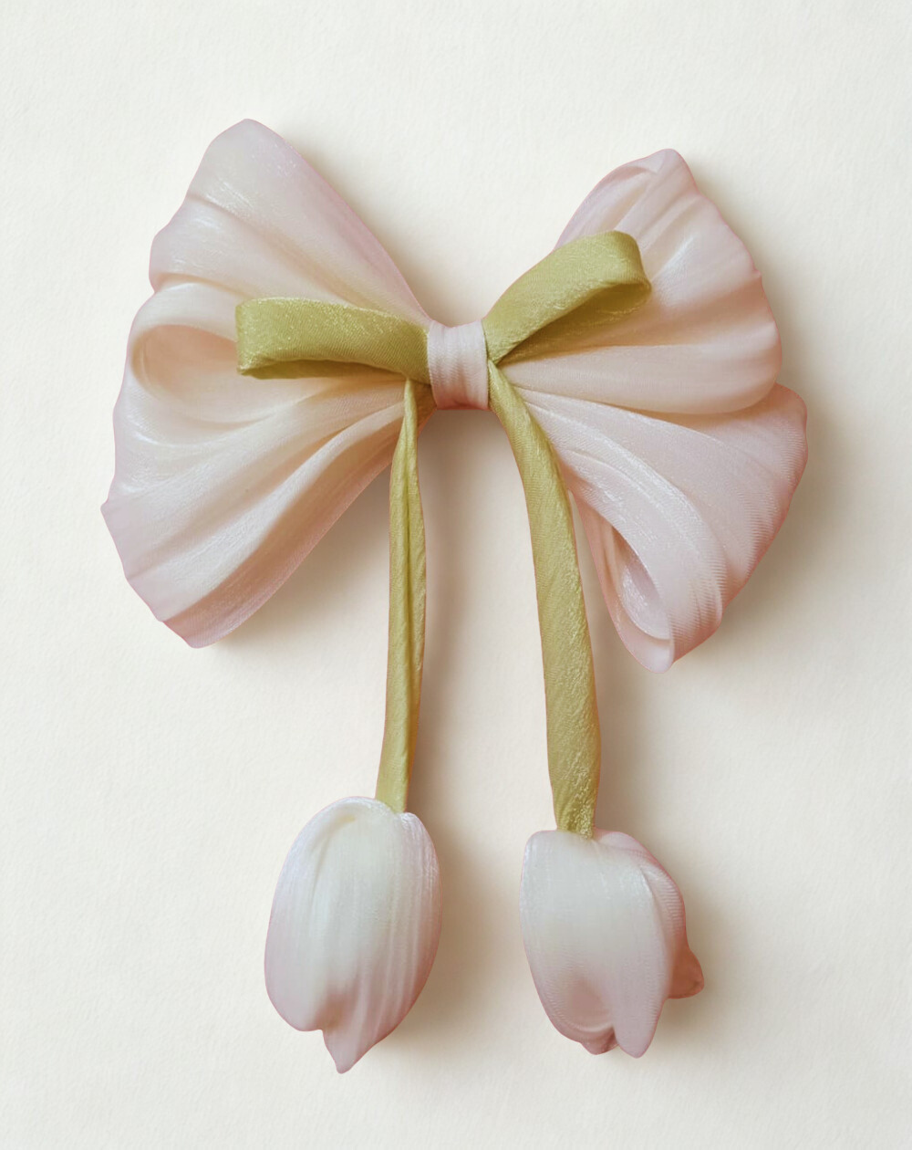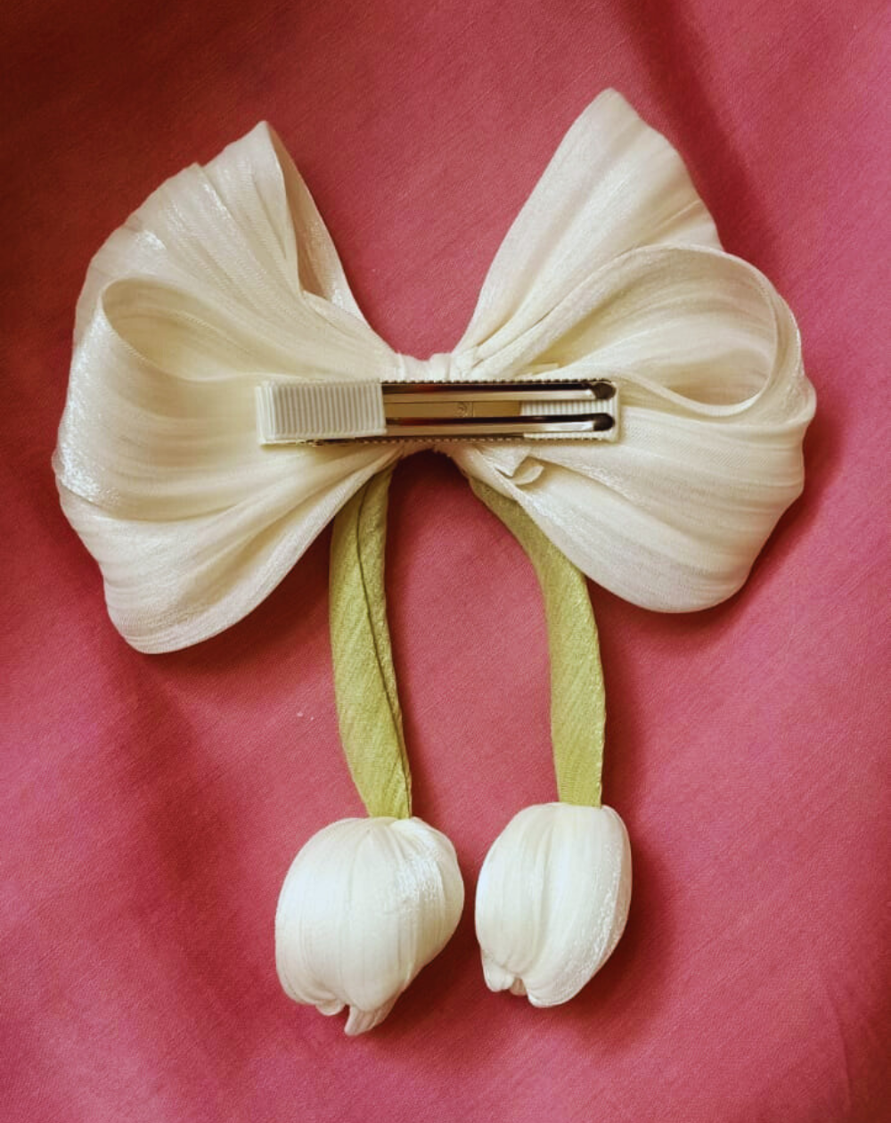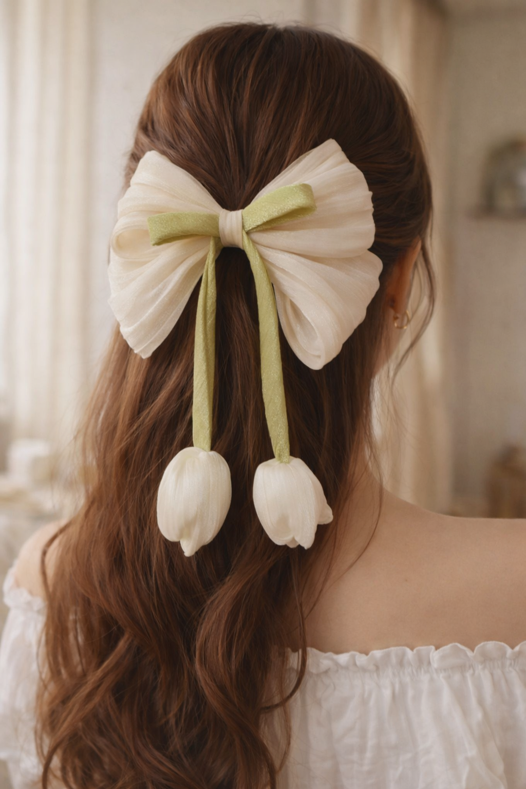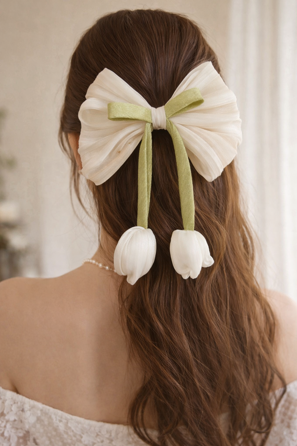 Designed with a sheer ivory organza bow, pastel ribbon detailing, and handcrafted tulip-shaped fabric drops, this accessory blends elegance with a cute, romantic style. The lightweight design sits naturally in the hair, making it perfect for half-up hairstyles, ponytails, or loose hair.