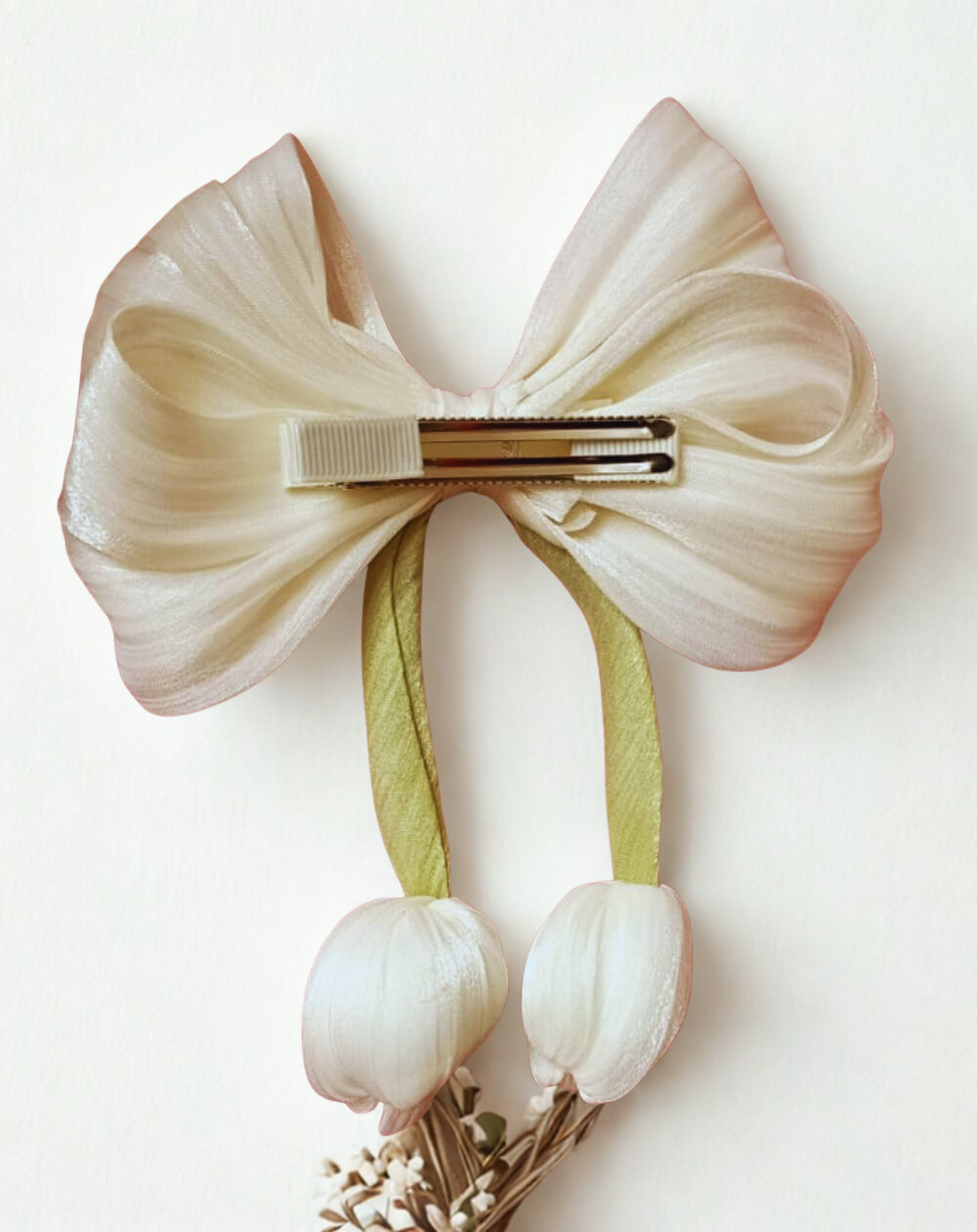 Korean Style Organza Bow Hair Clip with Tulip Drops (Cream)