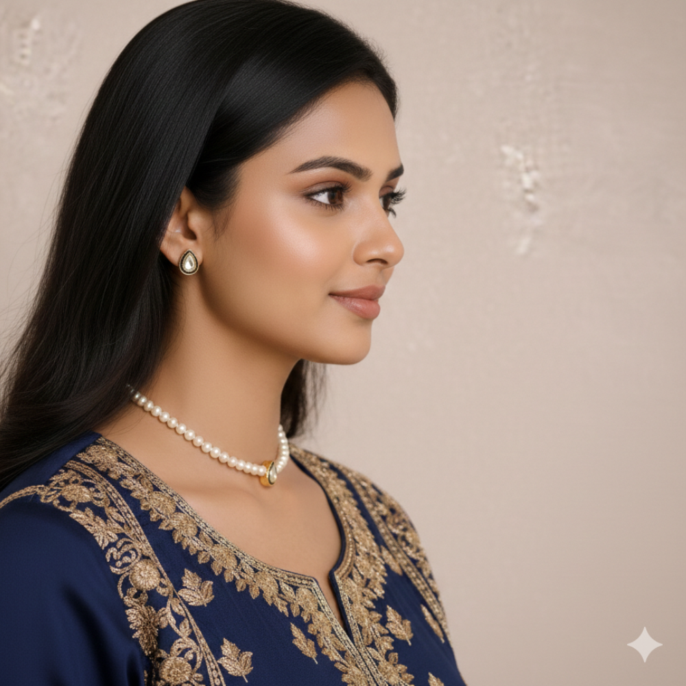 Inspired by traditional elegance, this pearl choker features a teardrop gold pendant centerpiece that adds a regal touch. Perfect for ethnic outfits, weddings, and festive occasions, this piece blends heritage charm with contemporary craftsmanship.